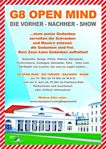 Du hast was zum G8-Gipfel zu sagen, dass Dir unter den Nägeln brennt? Auch wenn Du vielleicht kein guter Redner bist, Dich aber mit einem Song, einer Collage, einem Gemälde oder durch Tanz ausdrücken kannst oder einen Film zusammengestellt hast, von dem Du glaubst, er gehe mehr Leute als nur Dich an, dann komm vorbei und teile Dich mit!